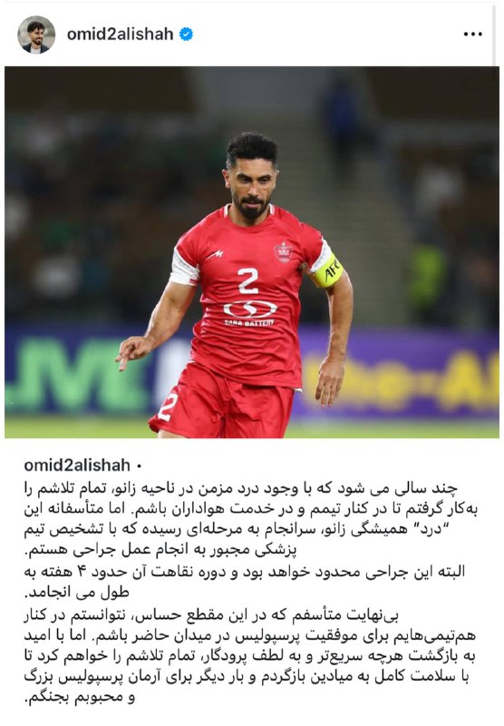 واکنش امید عالیشاه به خبر به پایان رسیدن فصل به دلیل مصدومیت