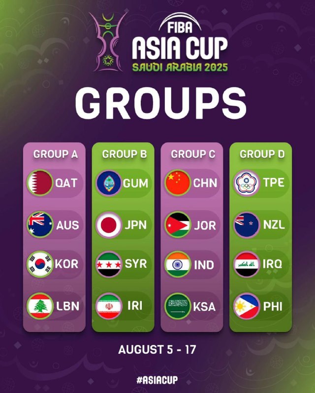 قرعه‌کشی کشی رقابت‌های کاپ آسیا #بسکتبال 2025 عربستان برگزار شد و تیم ملی ایران در گروه B با ژاپن، سوریه و گوام همگروه شد.