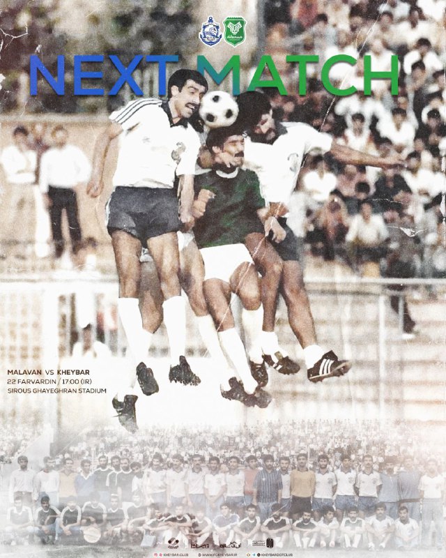 ⚪️پوستر جالب و زیبای باشگاه خیبر برای مسابقه برابر ملوان با تصویری از دیدار سال ١٣۶۵ دو تیم که ایرج باباعباسی با سیروس قایقران و محمد احمدزاده دو اسطوره ملوان برای تصاحب توپ به هوا بلند شدهاند.