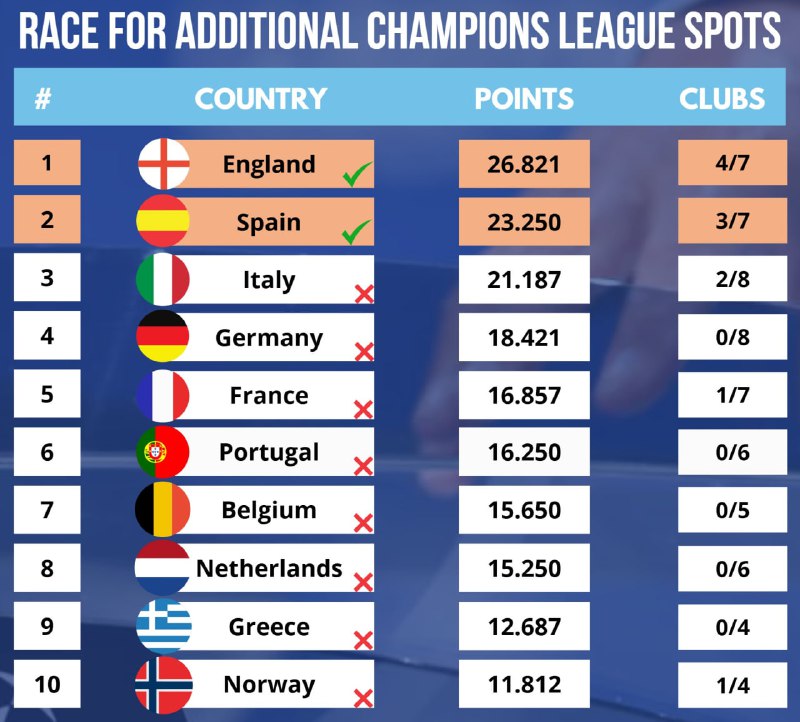 با نتایج بدست آمده در دیدارهای امشب لیگ های اروپایی، لالیگا نیز پس از پریمیرلیگ سهمیه پنجم لیگ قهرمانان اروپای فصل آینده خود را قطعی کرد.