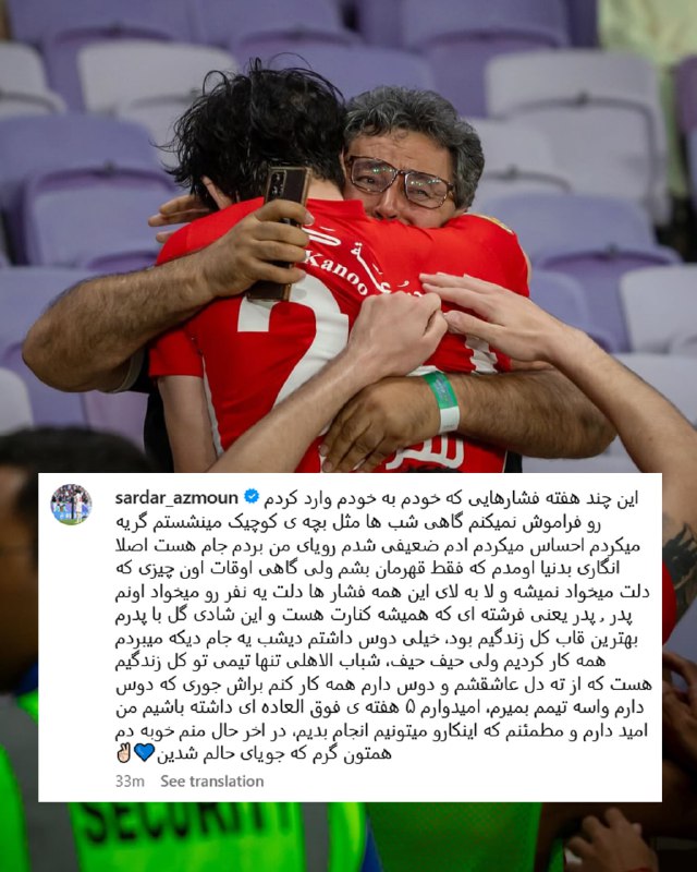 پست اینستاگرامی سردار آزمون پس از شکست در دیدار شب گذشته با عکسی در آغوش پدرش