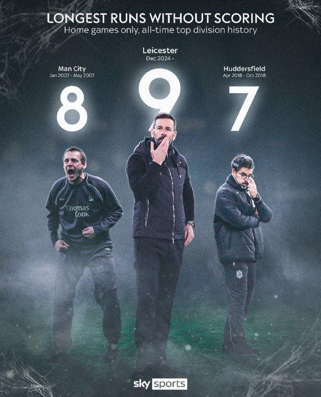 ❌🏴 لسترسیتی در 9 بازی خانگی اخیر خود در پریمیرلیگ موفق به گلزنی نشده است. این بیشترین تعداد بازی خانگی بدون گل در تاریخ سطح اول فوتبال انگلیس میباشد.