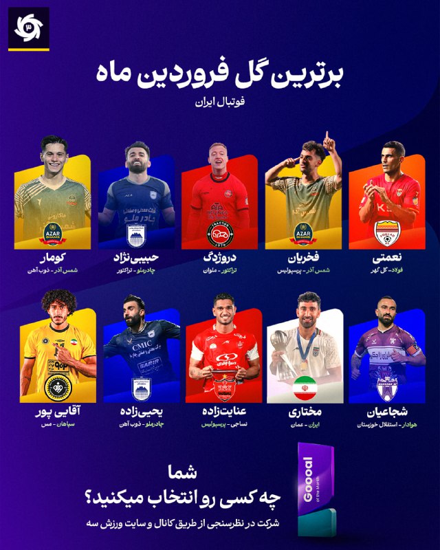 ⬇️به نظر شما کدام یک از این 10 گل، بهترین گل مسابقات فروردین ماه فوتبال ایران بوده است؟ در صفحه اصلی ورزش سه در نظرسنجی بزرگ ما شرکت کنید و به گزینه خود رای دهید.