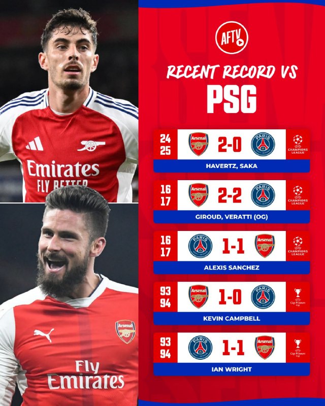 آرسنال و پاریسنژرمن تاکنون در مسابقات اروپایی 5 مرتبه به مصاف هم رفتهاند که توپچیهای لندن شکست ناپذیر بودهاند. دقیقا مشابه کارنامه رئالمادرید حریف دور پیش
