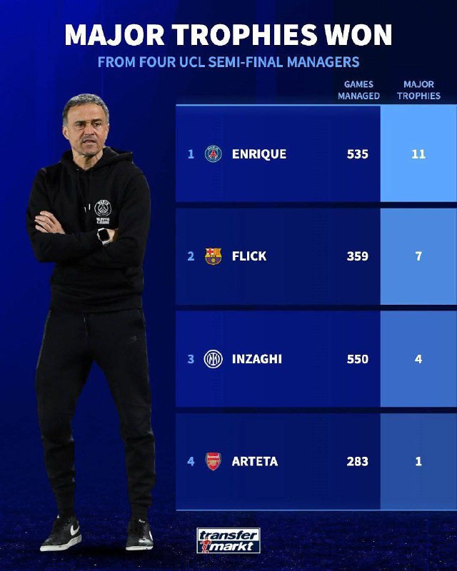 مقایسه تعداد افتخارات سرمربیان حاضر در مرحله نیمهنهایی #لیگ_قهرمانان_اروپا2025