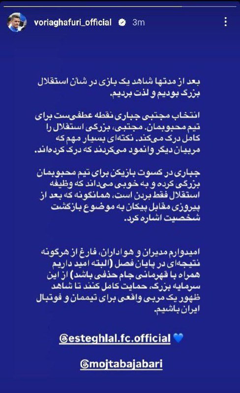 💬 بازی به اندازه هفتهای که گذشت و بد بود، بد بود. به نظرم لیاقت نداشتیم، ۲ امتیاز بالاتر از پرسپولیس هستیم و باید زندگی خودمان را در دو بازی بعدی بگذاریم تا جایگاهمان را حفظ کنیم. برنامه من این است که همه را قانع کنم که چقدر این دو هفته و دوم ماندن مهم است. چیزی که این هفته و امشب اصلاً حس نکردم، خیلی ناراحتم، مهم این است که لیگ را دوم تمام کنیم.