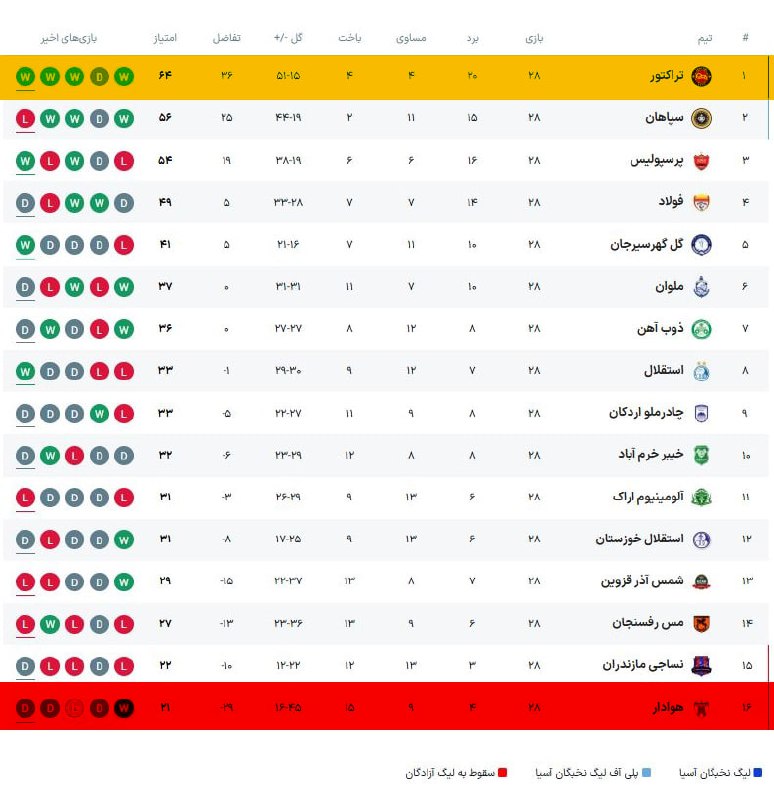 🇪🇺جدول لیگ برتر در پایان هفته 28