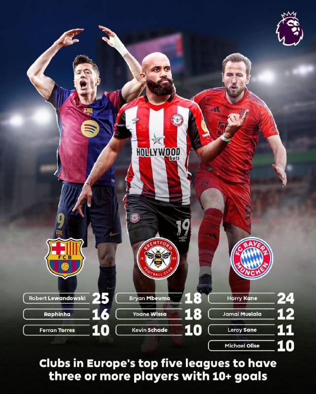 📊 #آمار 🏴 با گلزنی کوین شاده در دیدار شب گذشته برابر منچستریونایتد، برنتفورد در کنار بارسلونا و بایرن مونیخ به سومین تیم این فصل 5 لیگ معتبر اروپایی تبدیل شد که 3 بازیکن با 10+ گل دارد.