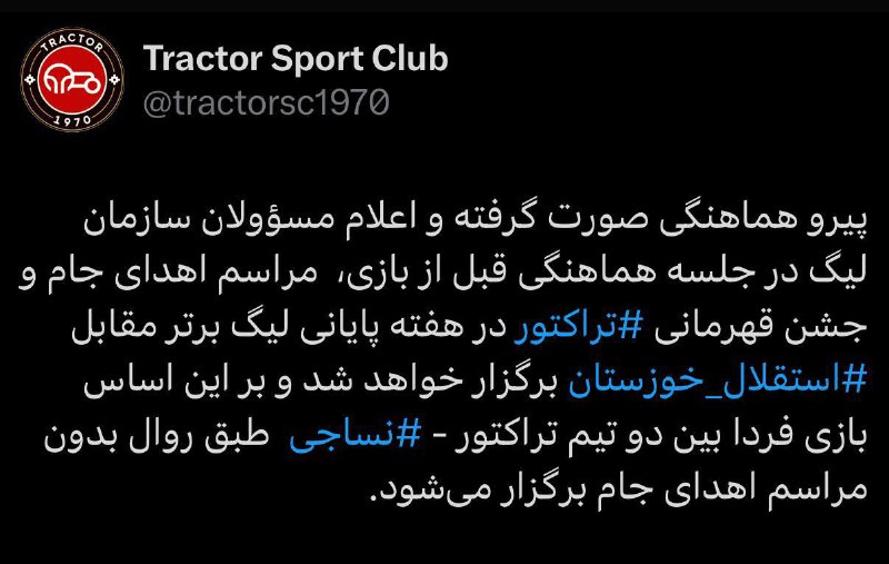 باشگاه تراکتور: جشن قهرمانی و اهدای جام هفته آخر برگزار می شود