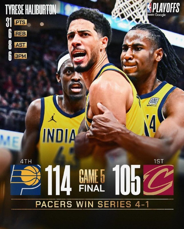 🟡ایندیانا پیسرز با پشت سر گذاشتن کلیولند بهترین تیم فصل عادی به فینال کنفرانس شرق رسید