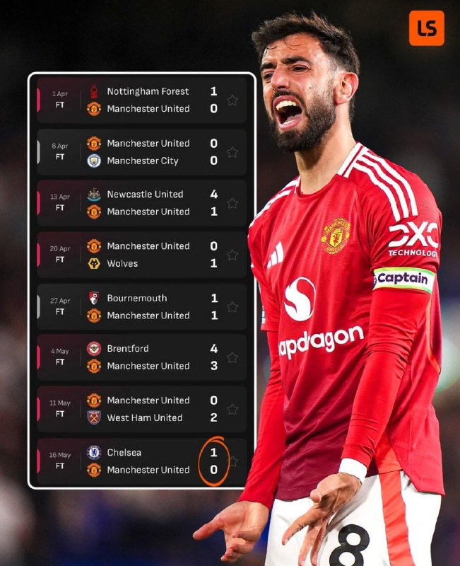🏴󠁧󠁢󠁥󠁮󠁧󠁿❌ منچستریونایتد برای اولین بار در تاریخ پریمیرلیگ، 8 مسابقه متوالی را بدون برد به پایان رساند.