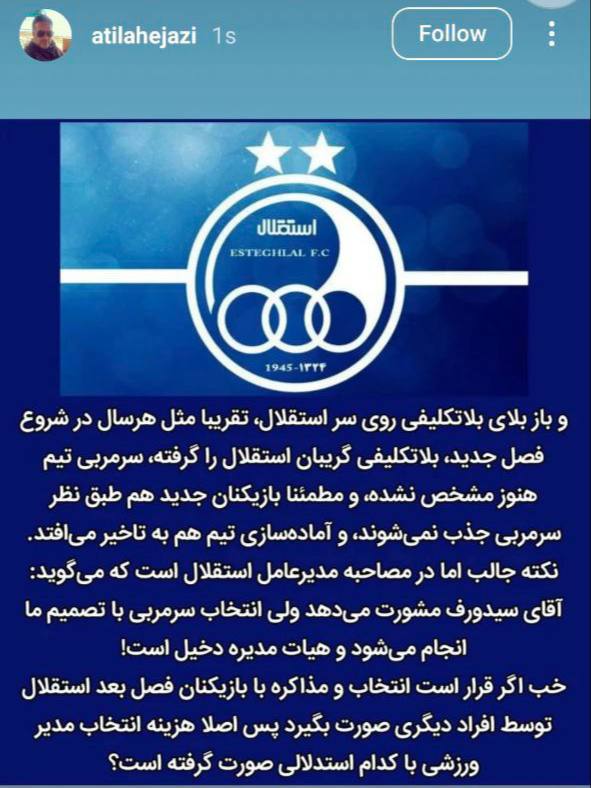 🔵انتقاد آتیلا حجازی از مدیران: بلاتکلیفی استقلال مسئله هر سال باشگاه قبل از شروع فصل