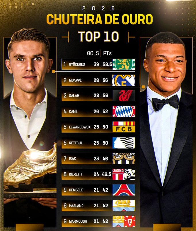 ویکتور گیوکرش با گلزنی در مسابقه روز گذشته به صدر جدول کفش طلا صعود کرد. درصورتی که امباپه، لواندوفسکی و صلاح بتوانند در 2 مسابقه آخر این فصل حداقل 2 گل به ثمر برسانند، میتوانند جای