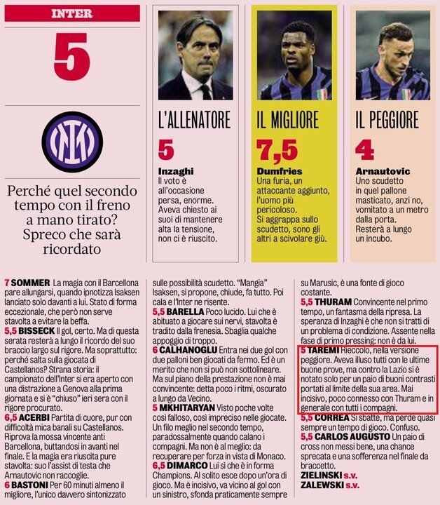 روزنامه گاتزتا دلو اسپرت ایتالیا به تحلیل عملکرد بازیکنان اینتر پرداخت و در عملکرد مهدی طارمی گفت: طارمی بعد از چند بازی خوب که امید هارا زنده کرده بود، در مقابل لاتزیو بار دیگر محو بود به جز دو تکل که در نز