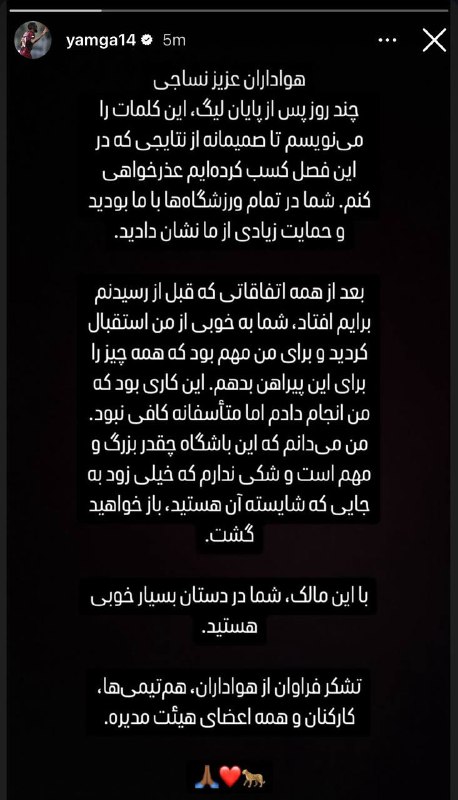 ستاره فرانسوی تیم نساجی چند روز بعد از پایان لیگ با انتشار استوری به سقوط این تیم به دسته یک واکنش نشان داد. او در این استوری اینستاگرامی از هواداران نساجی عذرخواهی کرد و به آن‌