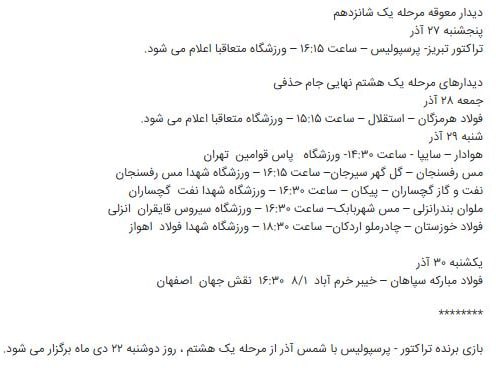 🔵دیدار فولاد هرمزگان و استقلال، جمعه 28 آذر 🟡⚪️دیدار سپاهان و خیبر، یکشنبه 30 آذر 🔹دیدار برنده تراکتور/پرسپولیس با شمسآذ
