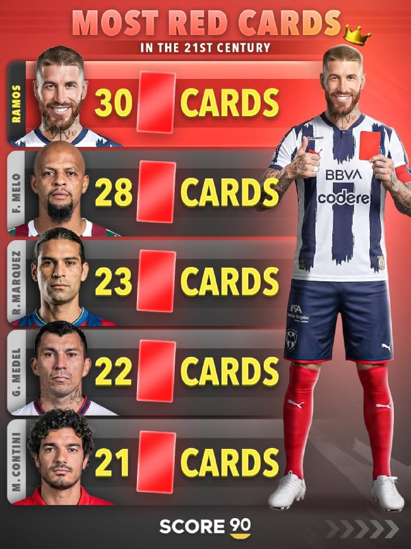 🚩سرخیو راموس که قراردادش هم با مونتری به پایان رسیده و شایعاتی از بازگشتنش به اروپا و حتی میلان شنیده میشود با دریافت 30 کارت قرمز در تاریخ فوتبال رکورددار است.