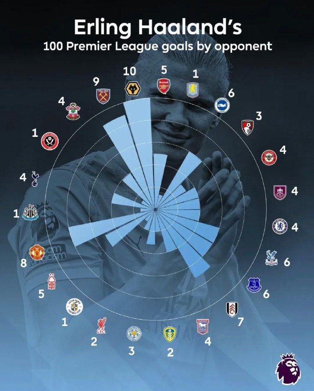 ⚡️ 100 گل ارلینگ هالند در پریمیرلیگ به تفکیک باشگاهها