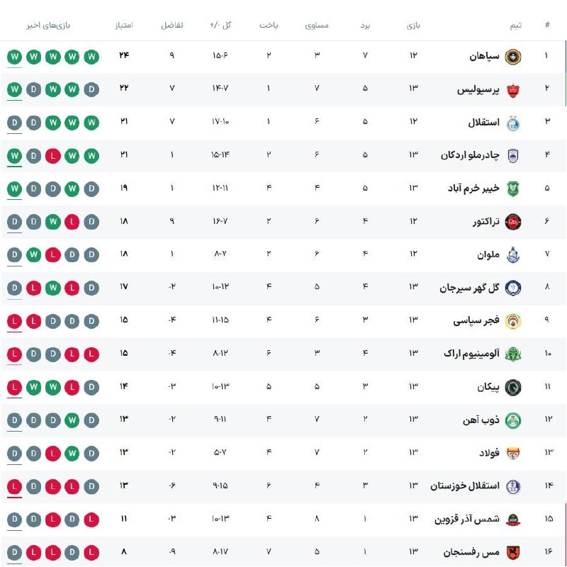 🇪🇺 جدول لیگ ایران در پایان هفته سیزدهم