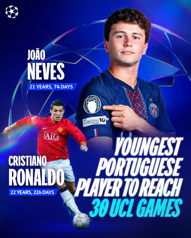 🔼 ژائو نوس، هافبک پاریسنژرمن، با حضور در بازی دیشب تیمش، با 21 سال و 74 روز به جوانترین بازیکن پرتغالی تبدیل شد که 30 بازی در لیگ قهرمانان اروپا را تجربه کرده است. پیش از این، کریستیانو رونالدو