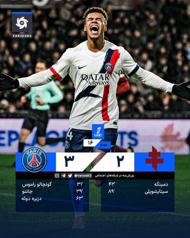 ⚽️🇫🇷 گل سوم پاری‌سن‌ژرمن توسط دوئه در دقیقه 63