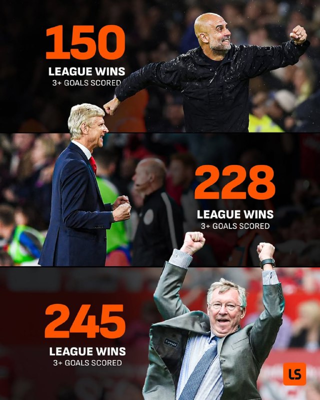 📊#آمار |🔼پپ گواردیولا با پیروزی 3-0 برابر پالاس در کنار سرالکس فرگوسن و آرسن ونگر به سومین سرمربی تاریخ پرمیرلیگ تبدیل شد که موفق به ثبت حداقل 150 پیروزی با مثبت 3 گل زده می‌شود.