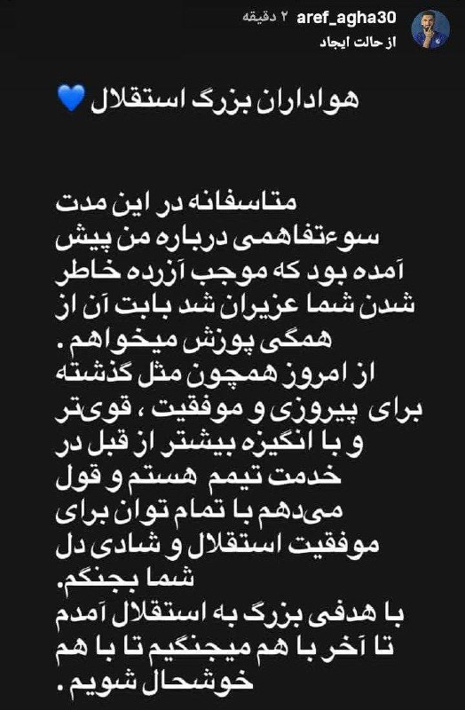 🔵عذرخواهی عارف آقاسی از هواداران استقلال