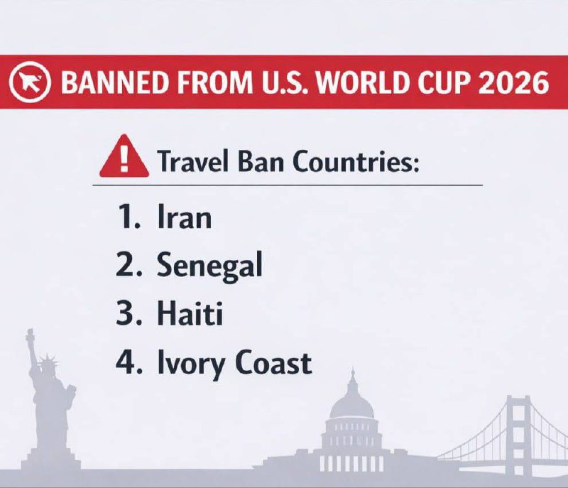 🚫نام دو کشور سنگال و ساحل عاج در فهرست محدودیت سفر به آمریکا قرار گرفت. پیش از این در میان 48 کشور حاضر در جام جهانی تنها ایران و هائیتی با این محدودیت مواجه بودند.