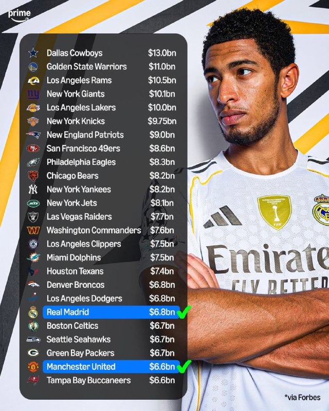 💰🔝در پایان سال 2025 نشریه فوربس لیست ارزشمندترین تیمهای ورزشی جهان را اعلام کرد که دالاس کابویز از NFL با ارزش 13 میلیارد دلاری ارزشمندترین باشگاه ورزشی جهان
