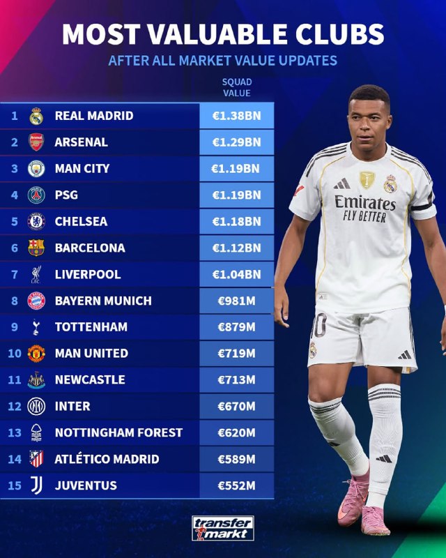 🔄پس از آخرین آپدیت ترانسفرمارکت، رئالمادرید با ارزش اسکوادی 1.38 میلیارد یورویی گرانترین تیم حال حاضر جهان است و پس از آنها ارسنال و منچسترسیتی با ارزش 1.29