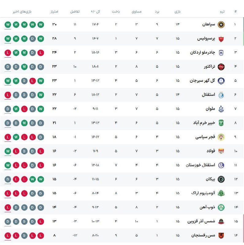 🇪🇺 جدول لیگ ایران در پایان مسابقه امروز