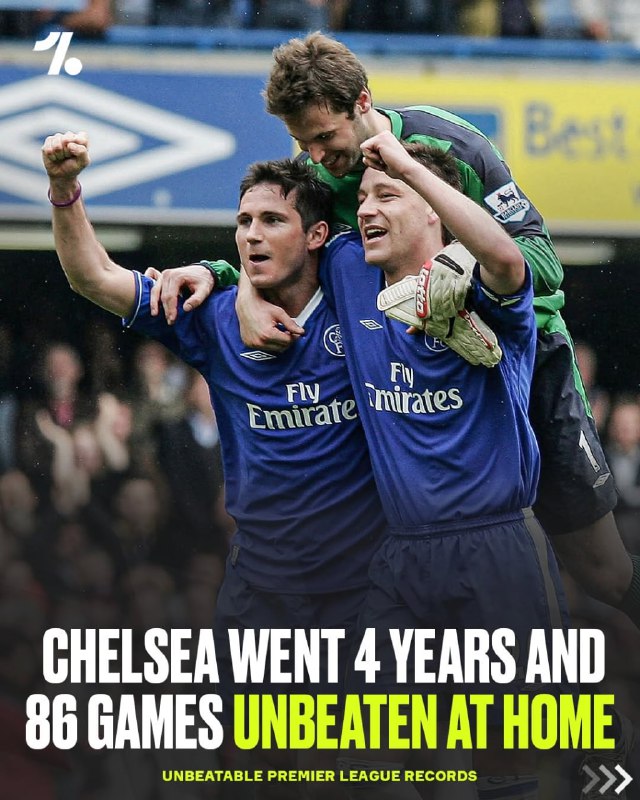 🏴☄️چلسی حدفاصل سال 2004 تا 2008 و در 86 مسابقه در خانه هیچ شکستی متحمل نشدند و بیشترین توالی شکستناپذیری خانگی در تاریخ پرمیرلیگ را در اختیار دارند.