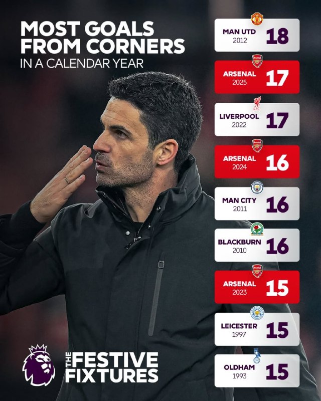 📊بیشترین گل از روی نقطه کرنر تیمهای پرمیرلیگ در یک سال میلادی: