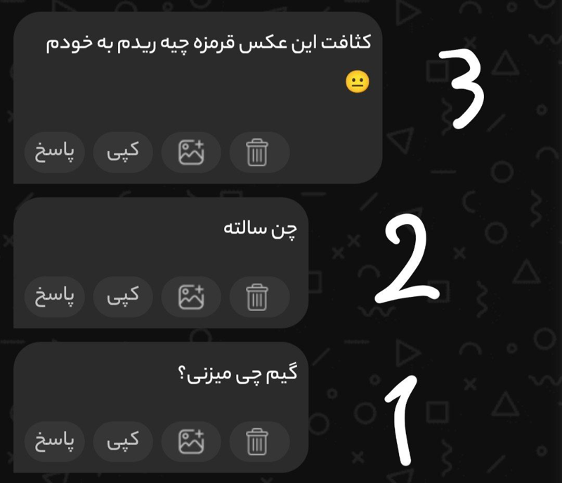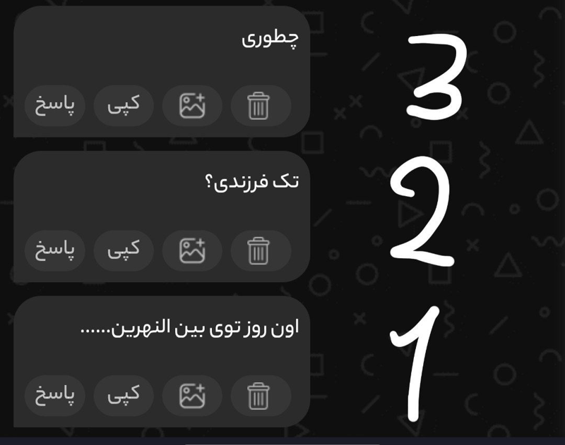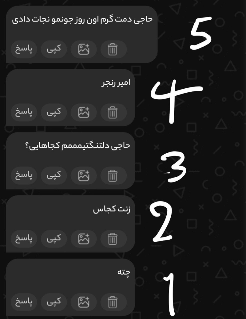 1. حاجی حال یه ایران بده👨🏻🦯 2. عاشقشم 3. چقد ازم میترسی؟ نه پیوی میای نه خودتو معرفی میکنی با چت های فیک میری پشت من بد میگی داستان چیه؟😂😂 4. هن🗿 5. نمیدونم 6 نکش