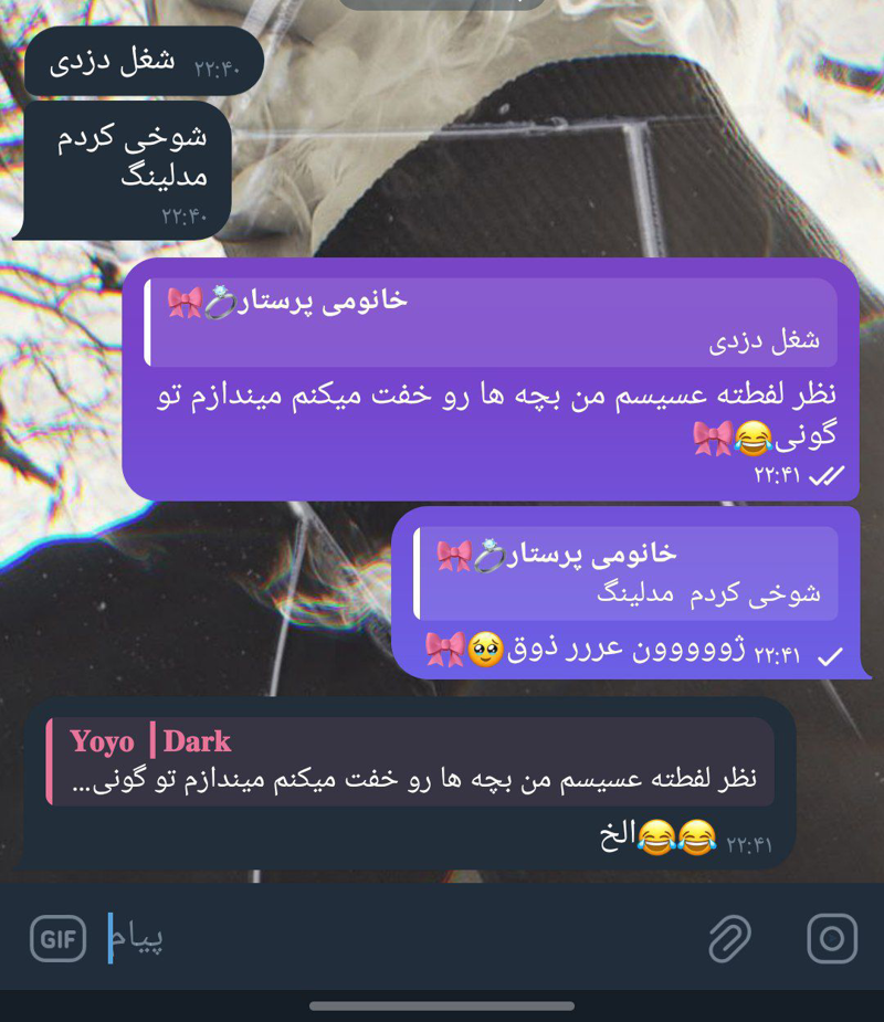 هاهاهاها آره میدونی تیکت تیکت میکنم اعضای بدنتو پست میکنم برا خانوادت مرتیکهههه😊🎀
